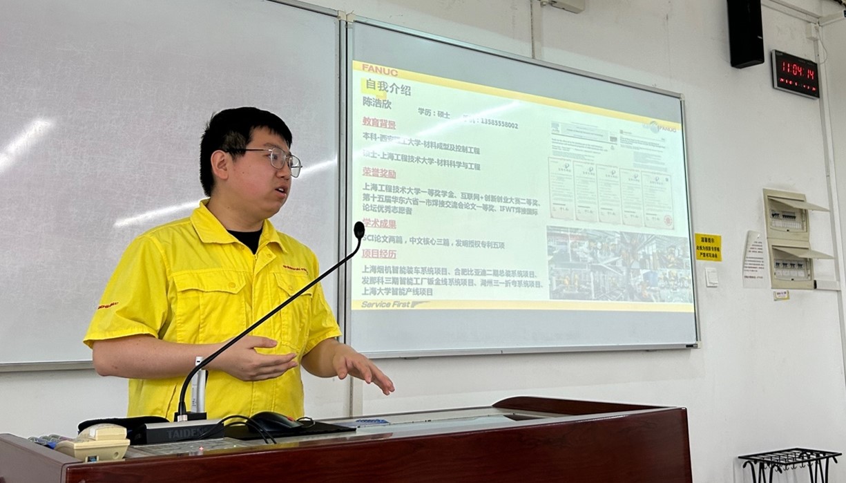 5月10号上午,金沙集团1862cc成色邀请上海发那科机器人有限公司技术经理陈浩欣走进《焊接过程测量与计算机控制》课堂,在教学楼D211为我校焊接工程与技术专业2021级本科生和部分研究生带来了一堂科技感满满的“发那科焊接机器人及其智能化应用”授课,让学生们更加深入地了解智能化焊接过程中各种传感器检测与计算机控制的重要性。