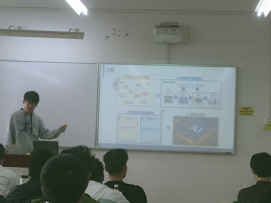 高博士详细介绍了半导体行业常见岗位,半导体产业链,并由此引出这些常见岗位与产业链所需要具备的知识技能(包括岗位通用技能和学科专业知识),之后介绍了芯片制造中各工艺站点的基本内容,并分享了材料制备与表征方法在其中的应用,最后对芯片制造产业进行了展望,强调了AI的重要性。高博士在课堂上与同学们进行了互动交流,并留下自己的联系方式,期待同学们后续一起讨论交流,从企业端的角度为同学们答疑解惑。