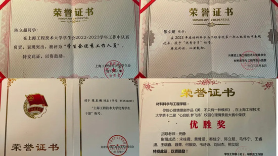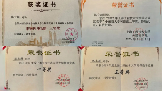 陈立超不仅在学业上取得了优异的成绩,绩点稳居年级第一(GPA3.85),更在各类科研竞赛中屡获佳绩。在11月30日结束的2024年全国大学生电装技术创新大赛中,陈立超作为团队骨干成员,凭借出色的创新思维和技术实力,带领团队荣获团体二等奖,再次展现了他在科研竞赛方面的卓越表现。陈立超先后荣获2023高教社杯全国大学生数学建模竞赛二等奖,2024年美国大学生数学建模竞赛二等奖,第39届全国部分地区大学生物理竞赛(上海赛区)非物理类B组三等奖。