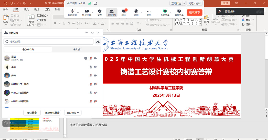 3月13日,金沙集团1862cc成色成功举办2025年中国大学生机械工程创新创意大赛铸造工艺设计赛校内选拔赛,比赛分为作品展示及答辩环节。特邀沈阳工业大学向青春教授、江苏大学赵信毅老师、黄淮学院李琦老师、之江实验室王赛老师组成专家评审组,在线上进行评审。本次校内选拔赛共有本科生及研究生17组学生参赛,40余名师生共同参与,创历史新高。