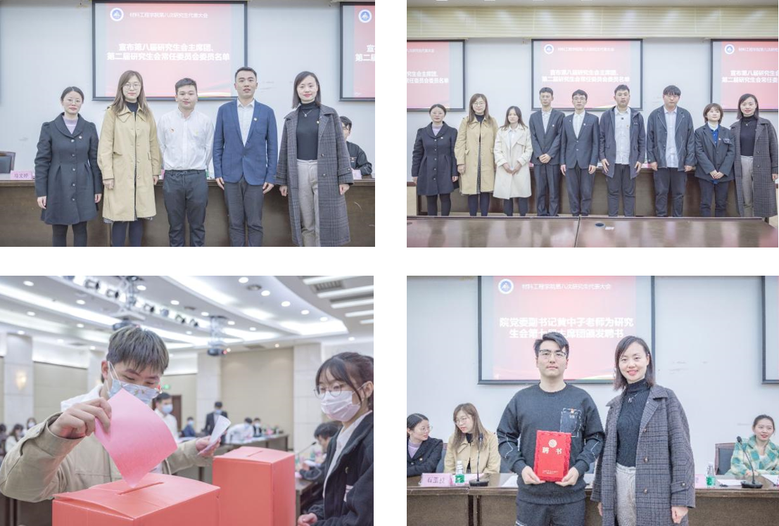全体代表现场审议通过了研究生代表大会的相关草案,以公平公正、民主选举为宗旨,通过无记名投票,选出胡学帅、王贞涛为第八届主席团成员,张鹏宇等为第二届研究生常任委员会委员。黄中子老师为第七届研究生会主席团颁发了聘书。