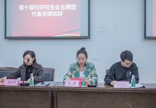 校第十届研究生会主席团代表张娣代表校研究生会对我院研究生代表大会表示支持和关注,并建议研究生会应进一步深化理论学习,在工作中始终保持生机勃发的态度,打造有凝聚力的学生组织。