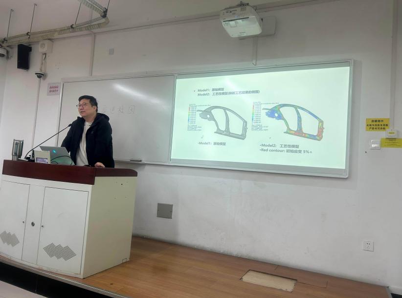 2025年11月3日,金沙集团1862cc成色邀请领益智造公司王斌技术主管走进《冲压工艺及模具》课堂,为材料成型及控制工程系2023级本科生带来了别开生面的冲压成形典型案例和个人成长经验体会的分享,开启了以“企业专家进校园”为主题的校企合作进行专业课程育人新模式尝试。在授课中王斌技术主管在为学生详细阐述了冲压实际生产情况及冲压生产特点,并结合自己在冲压领域的实际研究案例,还结合个人学习、工作经历,着重强调了冲压工艺在整个工业领域,尤其是汽车、航天及日常生活领域中的重要性,在课堂上和学生们积极进行互动交流和疑惑,为上课学生们提供了切实可行的专业知识学习和行业就业方面的指导,具体包括两部分内容: