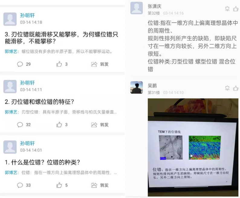 来看看精彩瞬间,孙明轩老师利用超星泛雅(学习通)平台,认真有序展开《材料化学导论》线上教学。课前精心准备,将课程简介、教学大纲、录制的教学视频、随堂测验及单元作业等上传到超星泛雅(学习通)在线教学平台上。课中全情投入,通过学习通群聊和QQ群引导学生签到、观看视频和问题讨论,与学生积极互动,保证在线教学质量。课后完成学习通上学生课后作业的批改及答疑解惑。