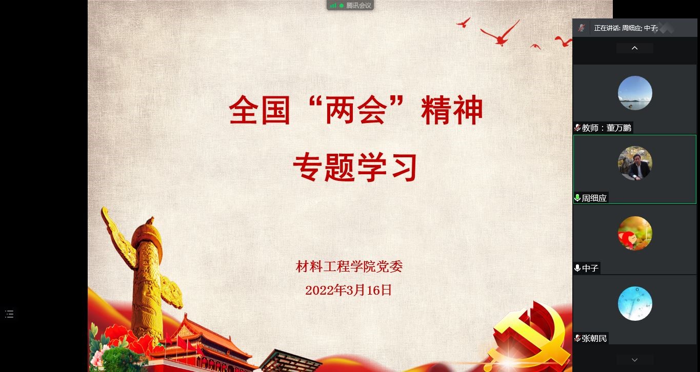 3月16日下午,金沙集团1862cc成色党委中心组采用线上会议形式专题学习2022年全国两会精神,学院党政班子成员、党委委员参加会议,会议由张朝民书记主持。