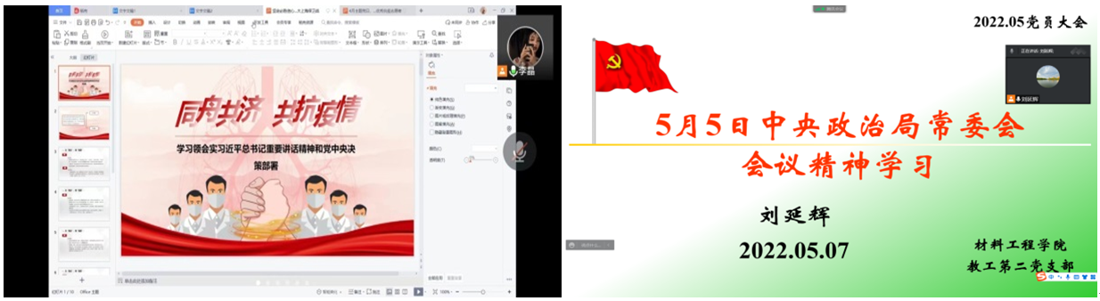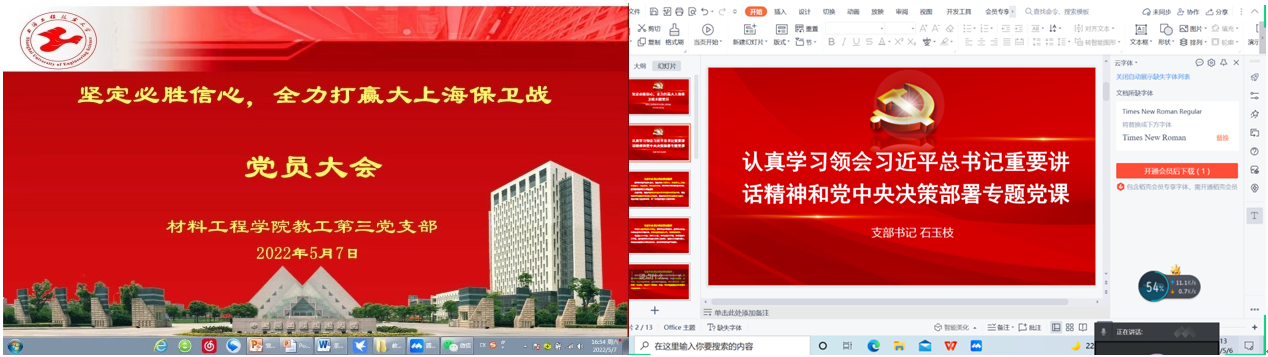 会上,党支部党员深入交流了学习体会。教工第二党支部书记刘延辉老师谈到,在疫情防控中,我们广大党员是抗疫一线的主力军,充分发挥了基层党组织战斗堡垒的作用,充分展现了基层党员的先锋模范作用。目前上海的抗疫保卫战处于最关键的时期,基层党组织和党员在上级党组织的领导下,要继续冲锋在前,顽强拼搏,团结群众,坚定信心,从严落实常态化疫情防控措施,打赢上海市疫情保卫战!本科生第三党支部党员杨清云表示,我们要坚定必胜信心,坚定“动态清零”的方针不动摇,要关爱身处一线的医务工作者,要紧紧依靠群众,打一场疫情防控的人民战争!作为身处上海的一分子,在疫情防控中严格自律、积极配合,就是为抗疫做出巨大贡献!